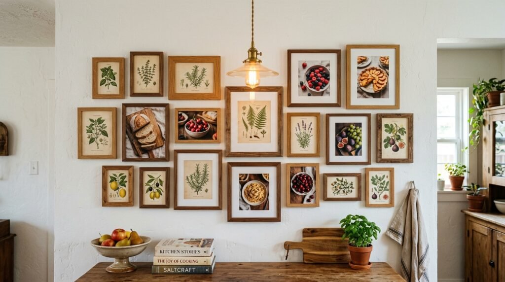 You don’t need to invest in expensive prints. Framed food photography, vintage botanical prints, a simple hand-lettered quote, or even an abstract piece you love — anything goes as long as it feels like you. A small gallery wall above the dining table or on a blank wall near the entrance to the kitchen can completely anchor the space.