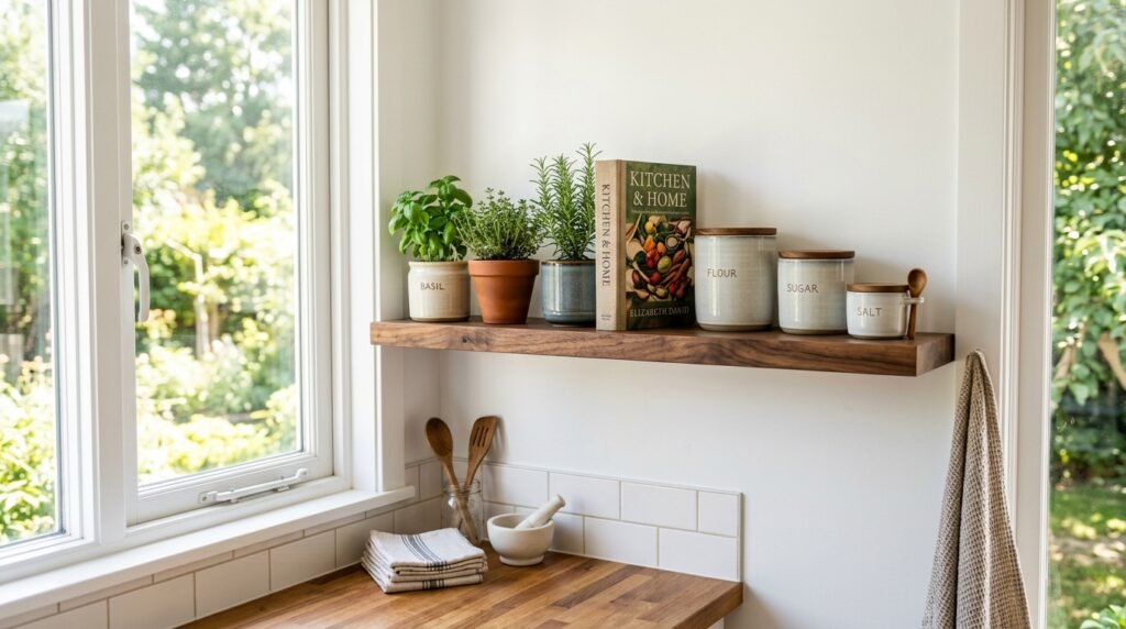 A single wooden floating shelf styled with a few plants, some matching canisters, and a cookbook or two can completely change the personality of your kitchen. It adds warmth, depth, and that lived-in, intentional look that makes a space feel like a home rather than just a room.