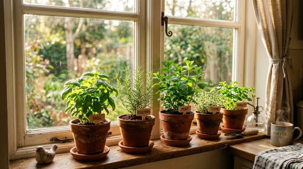 Herbs are especially great for kitchens because they’re functional as well as beautiful. A little row of basil, rosemary, and mint looks gorgeous and means you always have fresh herbs on hand when you’re cooking.