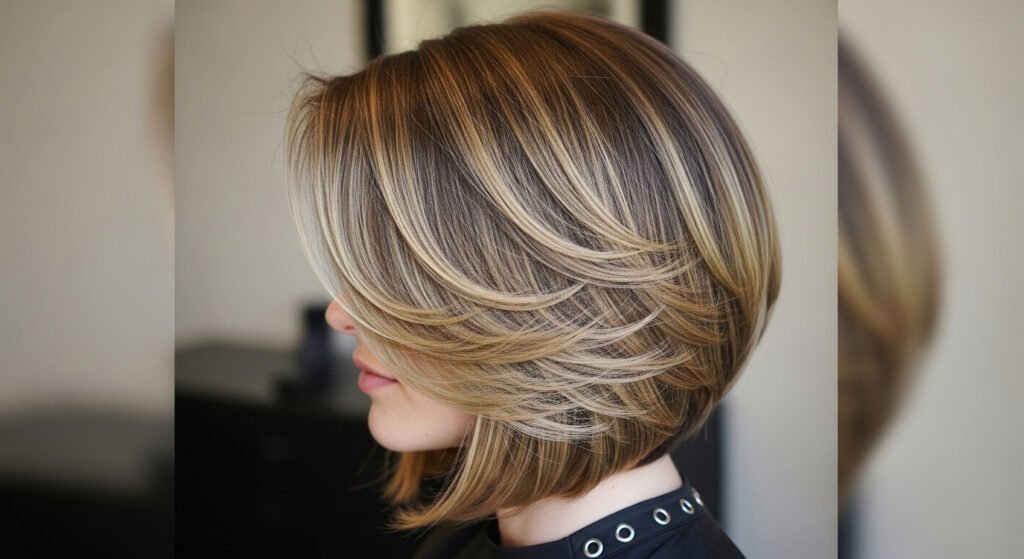 bob hairstyle becomes more dynamic and vibrant with color contrast. Highlights emphasize layers and texture, making hair appear fuller. It works beautifully
