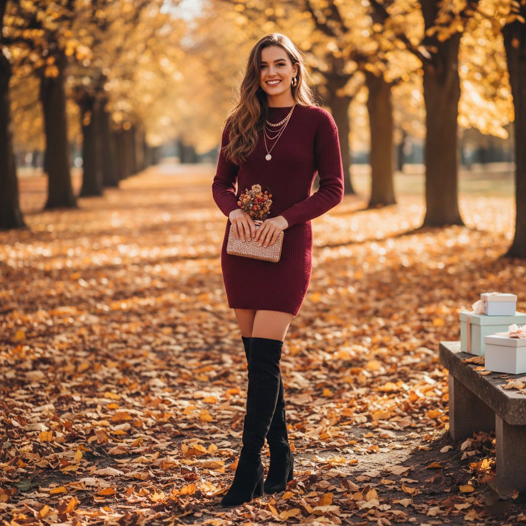 Sweater dresses are cozy, comfortable, and stylish—perfect for fall birthdays. Pair a fitted or oversized sweater dress with knee-high boots and statement earrings for