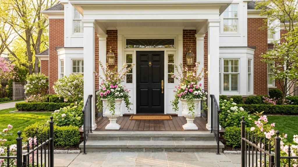 Choose planters in a color that complements your front door — black planters against a white door, terracotta against sage green, or white urns against a bold navy. The combination of your door color and matching planters is what creates that “wow” moment for anyone approaching your home.