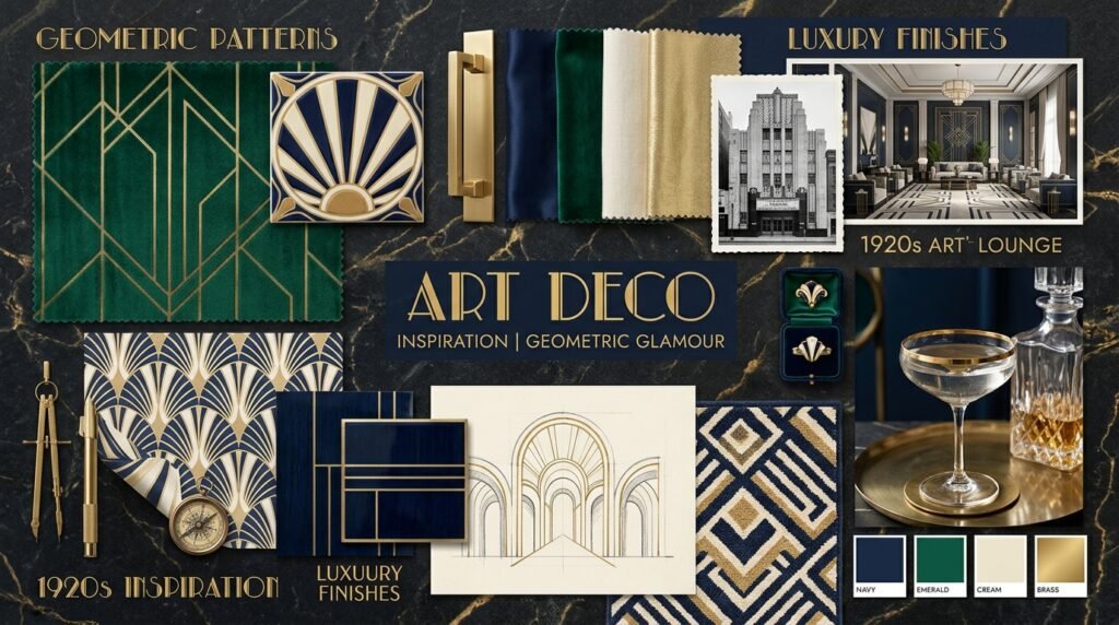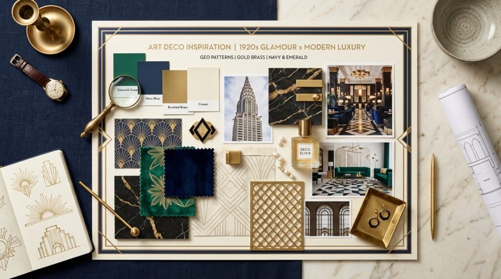 - Warm Gold and Brass — the signature metallic of Art Deco