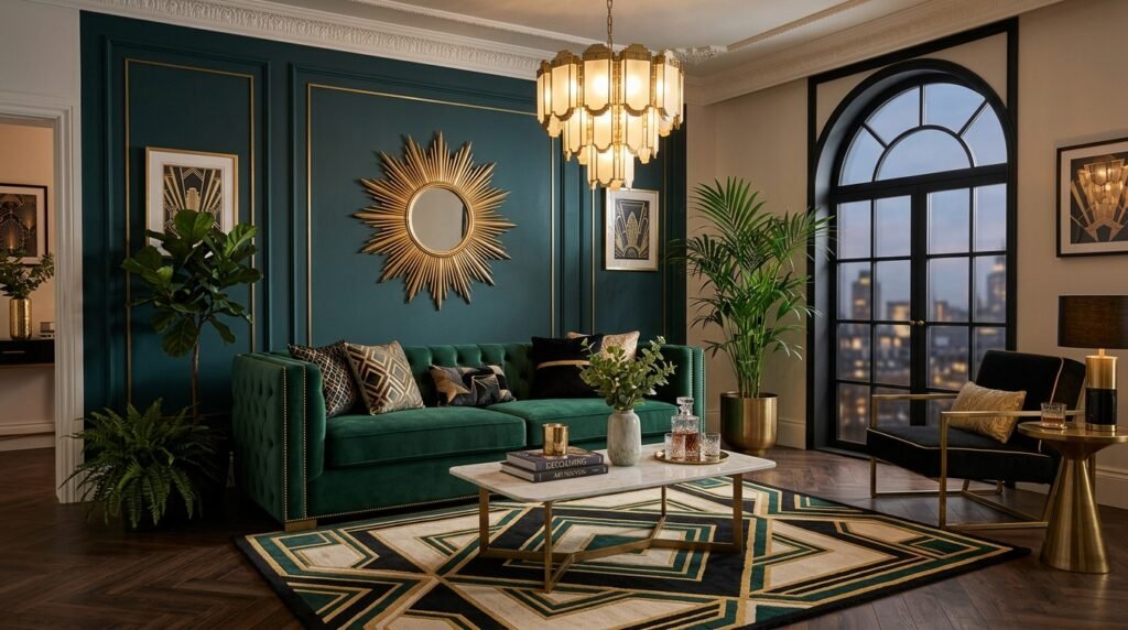 A geometric patterned rug in gold, black, and cream ties the floor together and immediately gives the space that Art Deco energy. Add a sunburst mirror above the sofa — arguably the most iconic Art Deco decorative piece — and you have instantly transformed a plain wall into a focal point.