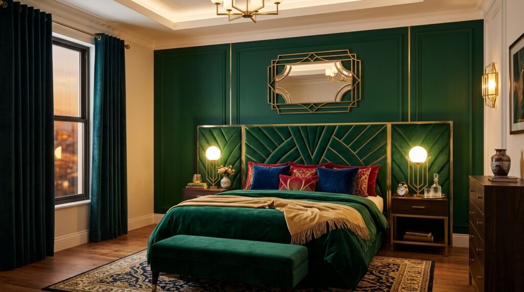 An Art Deco inspired headboard is the single most impactful change you can make to a bedroom. Look for headboards with geometric tufting, fan shapes, or sunburst patterns — these are quintessentially Art Deco and they photograph absolutely beautifully.