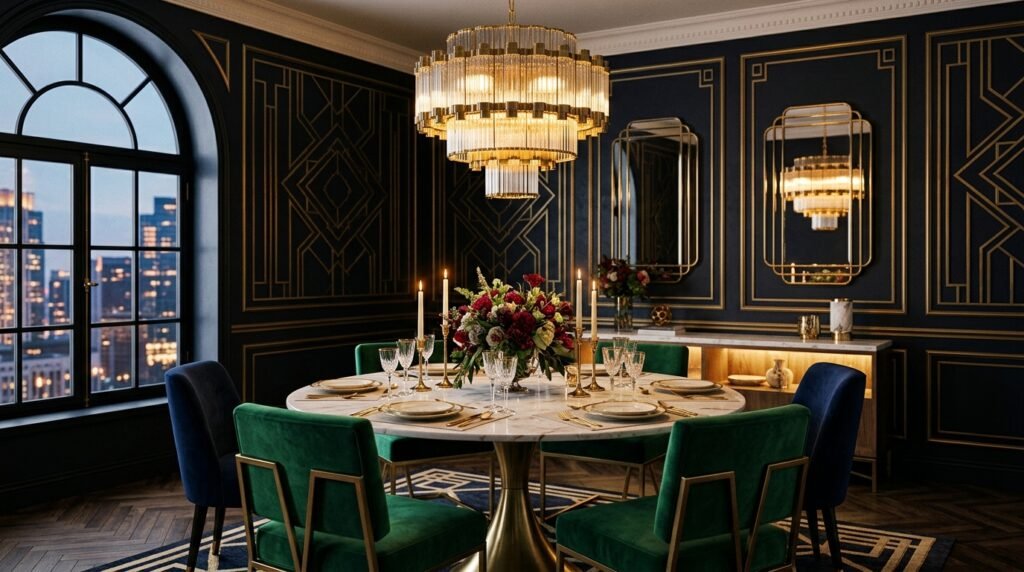 The chandelier is everything in a Neo Deco dining room. Look for geometric shapes, brass or gold finishes, and either dramatic drop pendants or tiered designs that feel grand and statement-making. This is not the room for a plain ceiling light.
