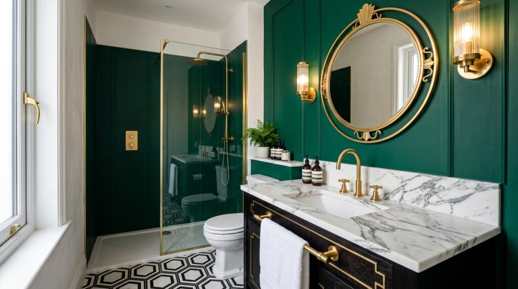 Black and white geometric floor tiles are the fastest way to bring Art Deco energy into a bathroom. They are widely available, not as expensive as you might think, and the impact they create is absolutely extraordinary.