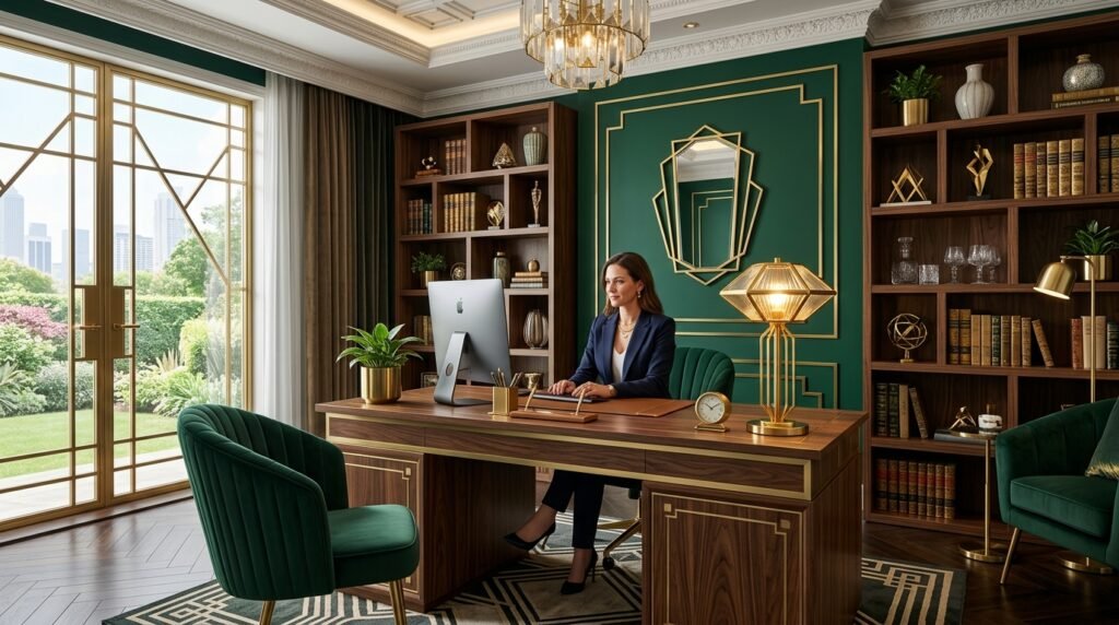 Paint your office wall in deep emerald or navy — research actually suggests that deeper, richer colors improve focus and creativity compared to plain white. Your Neo Deco office is not just beautiful, it is actually good for your work!