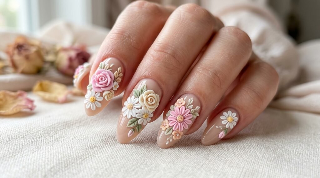 The key to beautiful raised florals is layering — each petal is built up separately using a fine brush or dotting tool, creating real depth and dimension. The result looks like someone placed a tiny real flower arrangement directly on your nail.