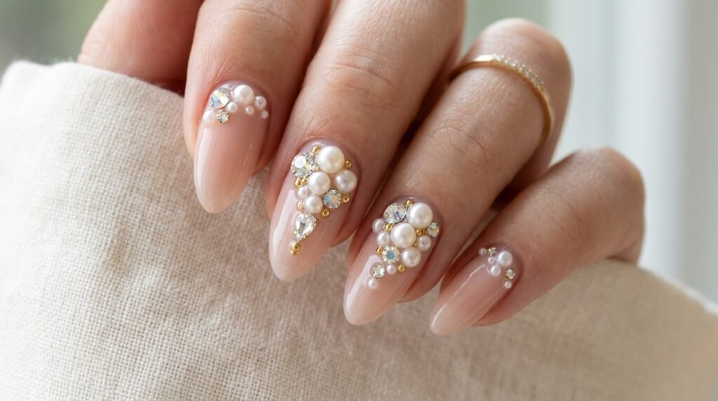 Furthermore, mixing pearls with tiny crystal gems creates a look that is both sophisticated and playful. This design photographs particularly beautifully because the reflective surfaces of the pearls and gems create a natural sparkle effect in any lighting.