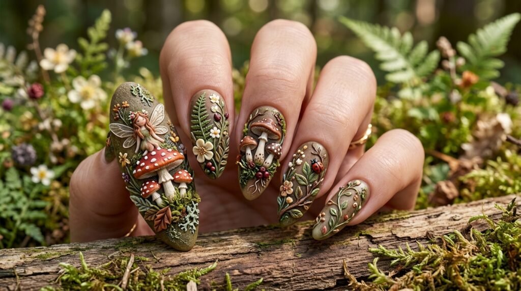 The Wilderkind aesthetic — one of Pinterest’s biggest 2026 trends — has fully made its way into nail art, and raised nature motifs are the perfect expression of it. Tiny sculptured mushrooms, leaves, acorns, and botanical details create nails that look like something straight out of an enchanted forest.